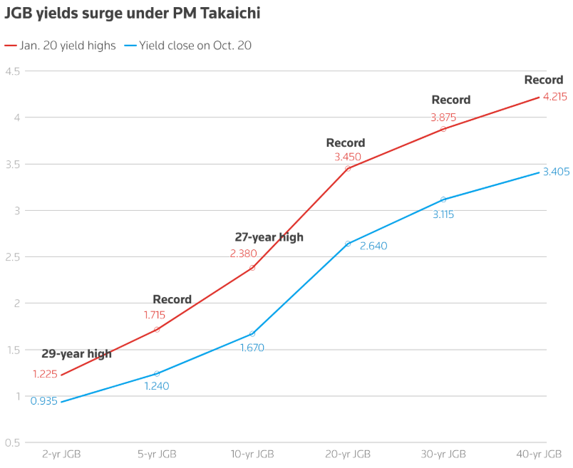 高市早苗承诺加强其扩张性财政政策并暂停对食品征收 8% 的销售税,这引发了人们对发行更多债务的担忧,导致债券收益率飙升,这可能会损害经济。
