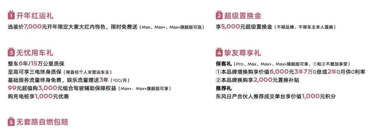 目前,东风日产官方提供限时至高12000元购车权益和无套路自燃包赔,提供整车6年/15万公里质保,首任个人非营运车主更可享三电终身质保,基础服务流量终身免费等。另外还提供有无套路自燃包赔政策,因三电系统质量问题导致车辆自燃,直接赔付同等配置新车,条款清晰,无额外限制且终身有效。