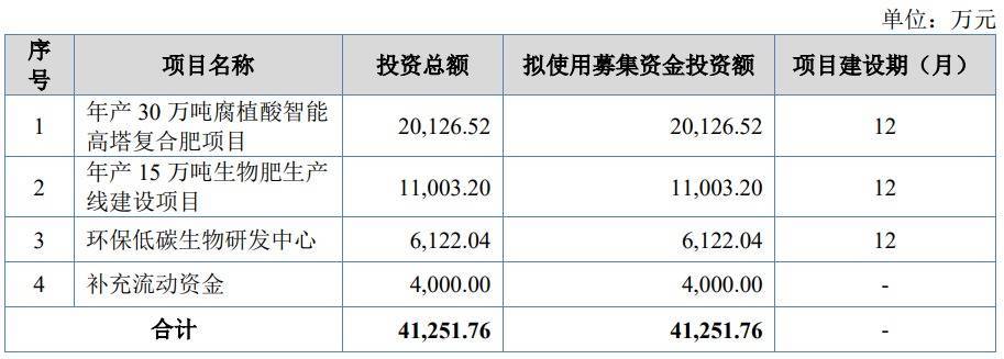 农大科技本次发行募集资金总额40,000.00万元鼎金投资,扣除发行费用后的募集资金净额35,806.56万元,比原计划少5,445.20万元。公司2026年1月25日披露的招股书显示,公司拟募集资金41,251.76万元,用于年产30万吨腐植酸智能高塔复合肥项目、年产15万吨生物肥生产线建设项目、环保低碳生物研发中心、补充流动资金。