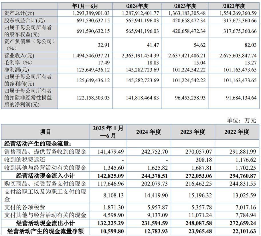2022年至2025年1-6月,农大科技的营业收入分别为267,560.38万元、263,742.14万元、236,319.15万元、149,454.60万元;净利润/归属于母公司所有者的净利润分别为10,116.35万元、10,122.45万元、14,528.27万元、12,564.94万元;归属于母公司所有者的扣除非经常性损益后的净利润分别为9,168.41万元、9,645.33万元、14,181.85万元、12,215.85万元。