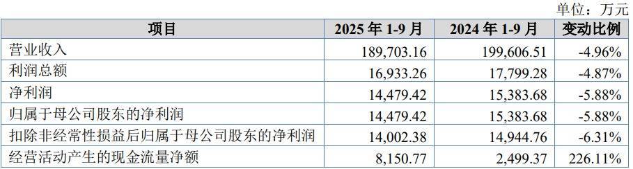 2025年1-9月,公司营业收入为189,703.16万元,同比减少4.96%;净利润/归属于母公司股东的净利润为14,479.42万元,同比减少5.88%;扣除非经常性损益后归属于母公司股东的净利润为14,002.38万元,同比减少6.31%;经营活动产生的现金流量净额为8,150.77万元,上年同期为2,499.37万元。